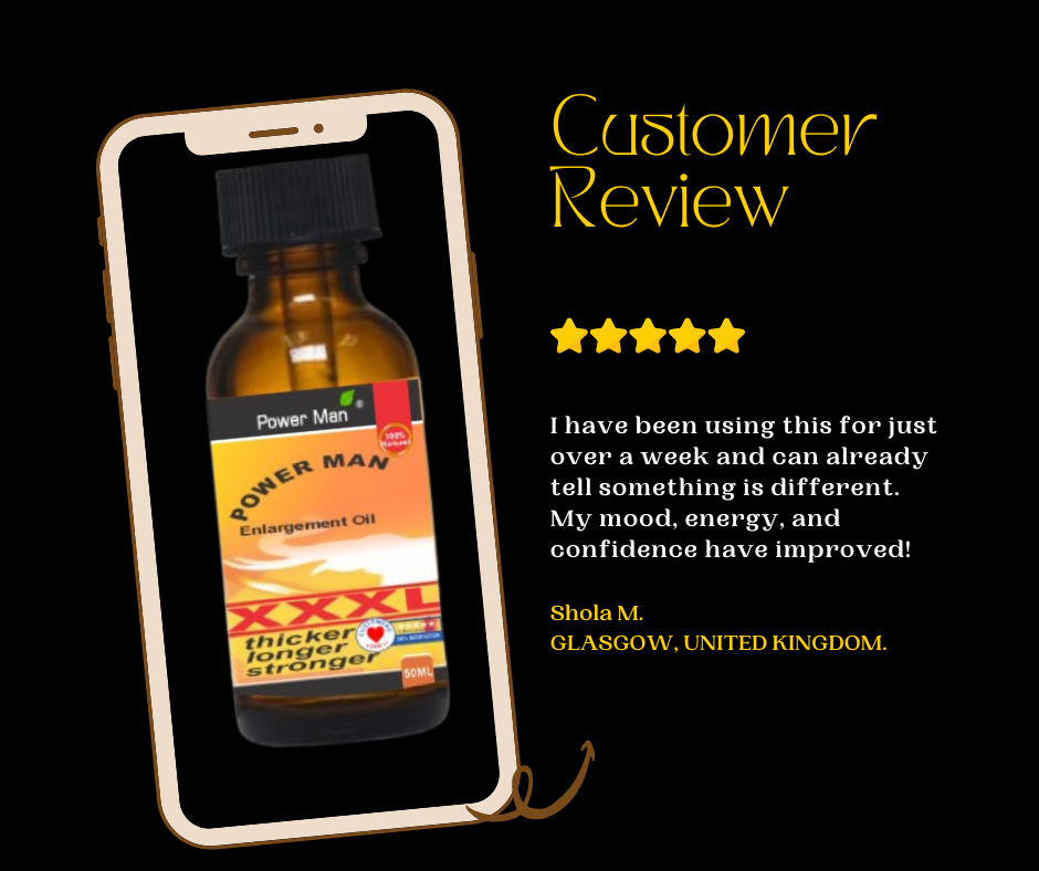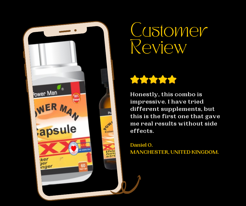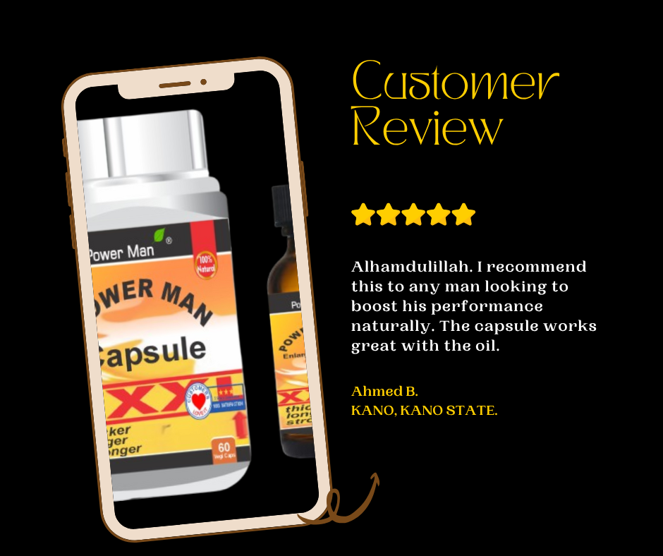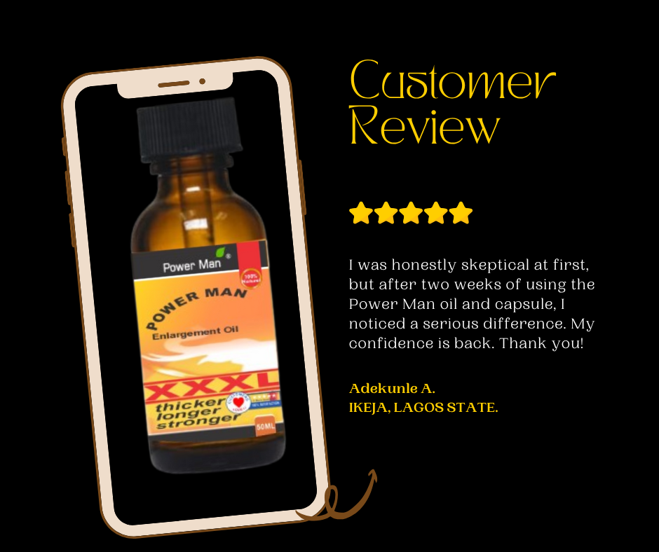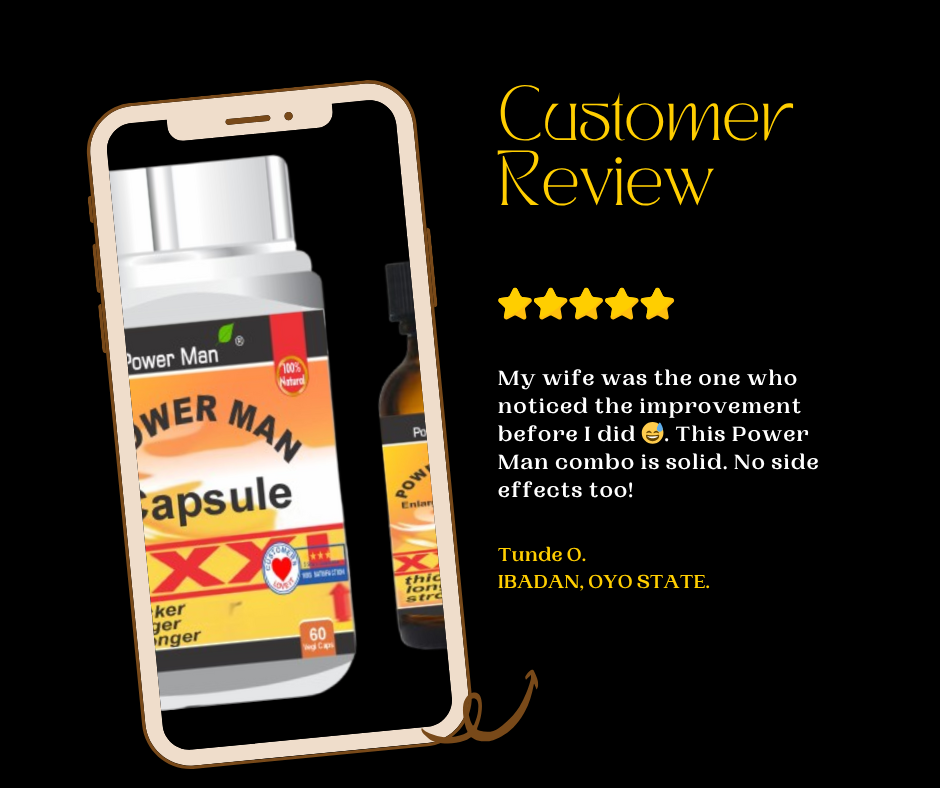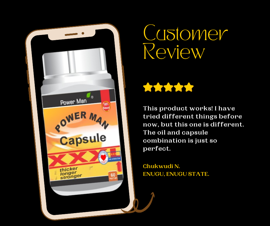 No matter your age, no matter how long you’ve been battling & suffering, the Shame Caused By Your Embarrassing Small Iroko, Weak Erektion And Chronic Premature Pouring, Our powerful, wonder working POWER MAN OIL & CAPSULES will help you regain your life and joy back.